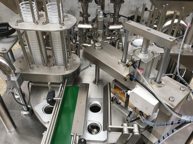 Introduction Fully automatic rotary cup filling & sealing machine can auto loading the empty cups, empty cups detecting, auto quantitative filling product into cup, auto loading the aluminum foil seal lids or auto loading roll plastic film, auto sealing cup or auto sealing cup and cutting film, auto discharging the finish product to conveyor. Base on different mold quantity, its capacity from 1200-4800 cups per hour, suitable for the foods and beverage factory production needs. Whole machine made by stainless steel 304 and anodizing aluminum, ensure it can running on bad food factory environment which has damp, steam, oil, acidity and salt etc. its body can accept the water rinsing clean. Using high quality imported electrical parts and pneumatic parts which ensure the stable running in long time, reduce the stop and maintenance time.